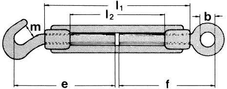Spannschloss mit je einem Haken und einer Öse eignet sich ideal zum Spannen, Nachstellen und Sichern von Drahtseilen, Ketten oder Abspannungen. Dank der einfachen Handhabung lässt sich die Seil- oder Kettenlänge schnell und präzise anpassen.